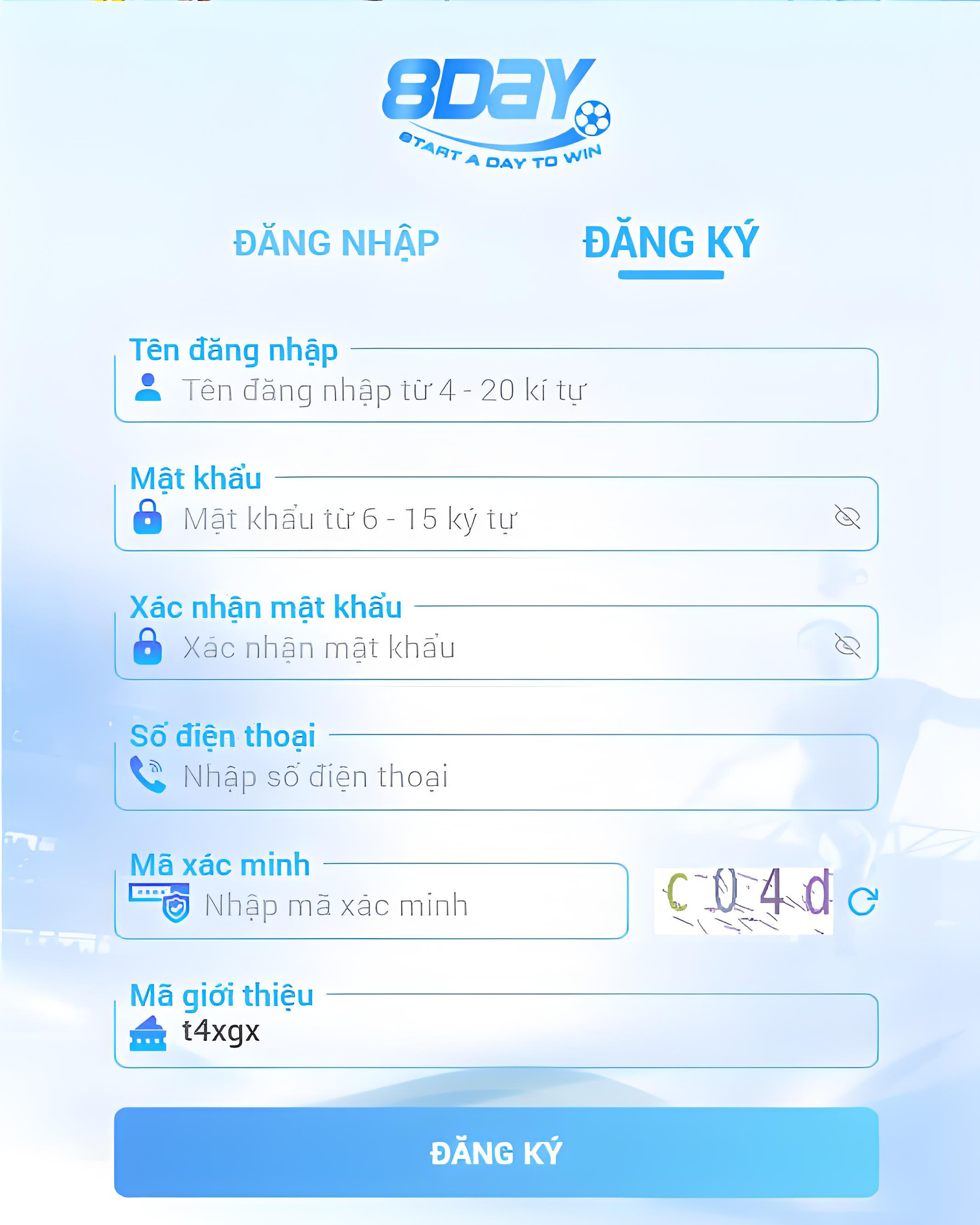Để có những phút giây trải nghiệm tuyệt vời tại nhà cái 8Day, bạn cần đăng ký ngay cho mình một tài khoản. Đăng ký 8DAY không chỉ đơn giản mà còn nhanh chóng. Trong bài viết này, 8Day sẽ hướng dẫn các anh em tân binh từng bước cụ thể trong quy trình đăng ký. Bất kỳ ai cũng có thể “ăn” ngay từ lần mở tài khoản đầu tiên.